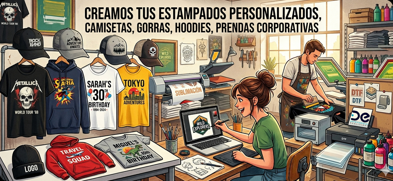 Tenemos amplia variedad de opciones de estampado: DTF, vinilo textil, sublimación, serigrafia y screen. Transformamos tus ideas en prendas únicas y personalizadas: camisetas, gorras, hoodies, mugs, termos, porta celulares, pad mouse, esferos y mucho mas.